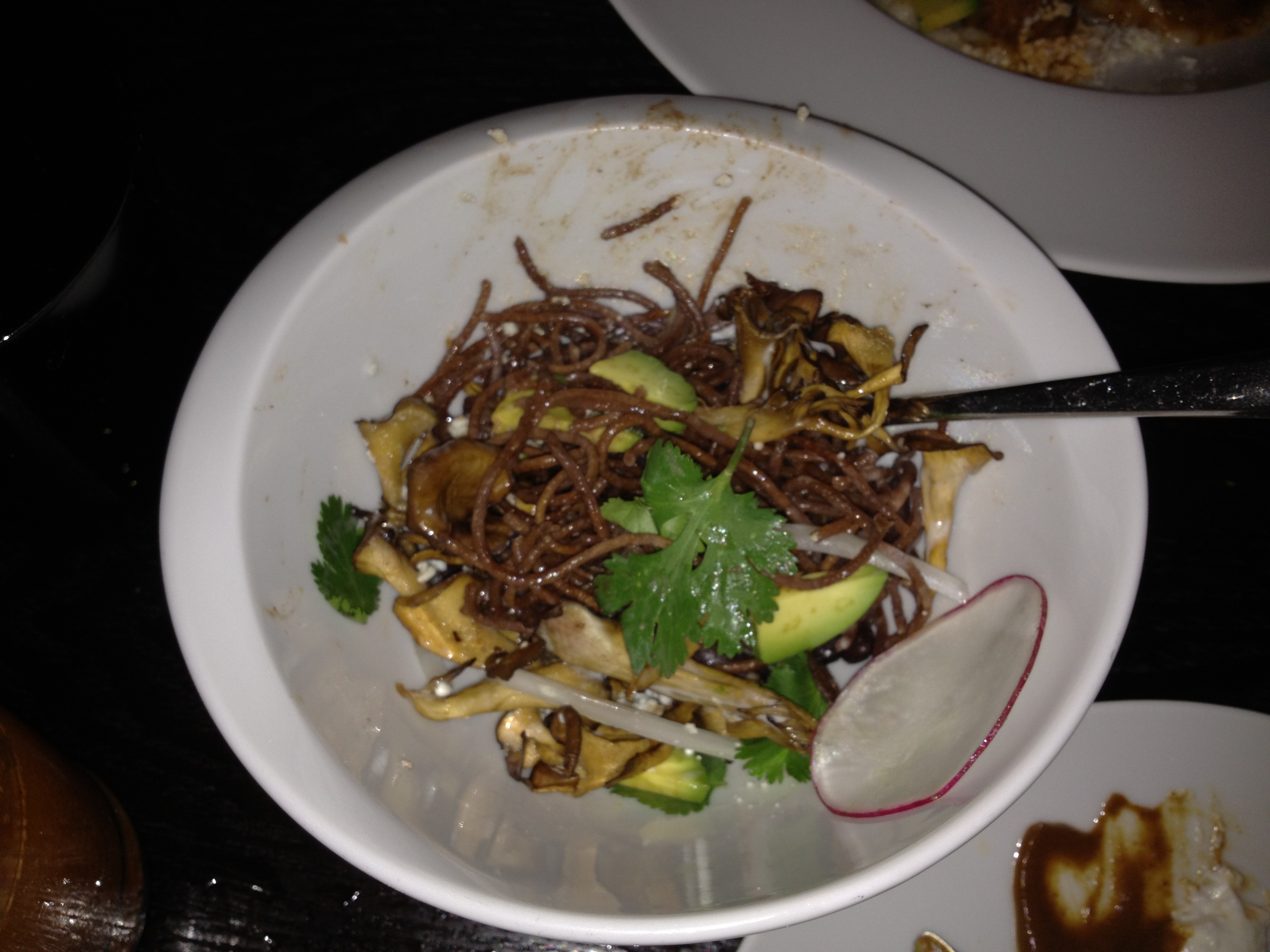 This dish with the mushrooms and the black bean vermicelli was my least favorite. The mushrooms were bland; the vermicelli dense, somewhat chewy, not spiced / salted adequately, while the sliced radish, the avocado, and the cilantro sprigs did nothing to enhance the flavor of the dish. Please order another dish instead of this one.