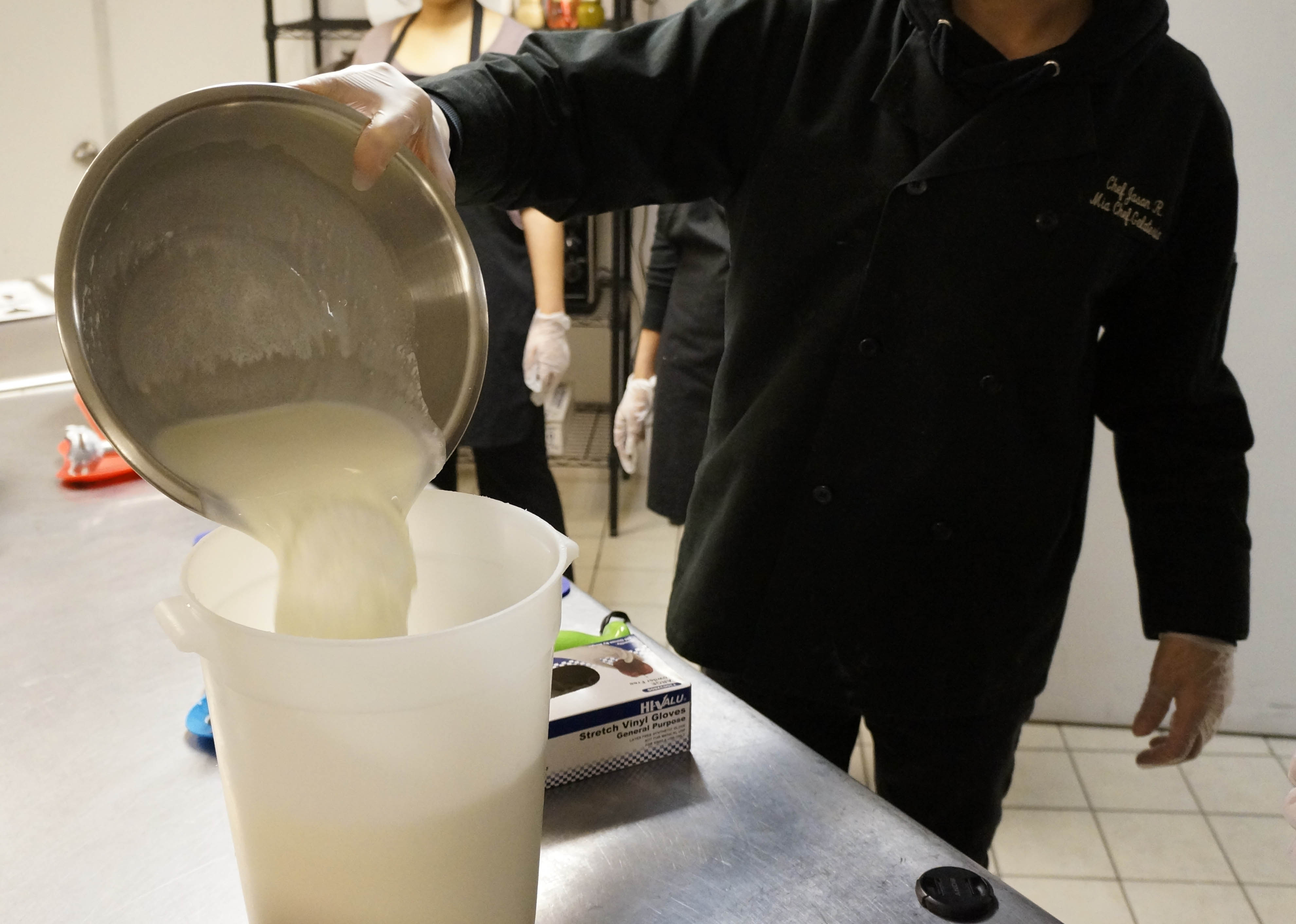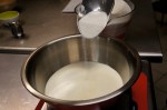 - Cream being added to milk to make the gelato base in the gelato making class at Mia Chef Gelateria in NYC