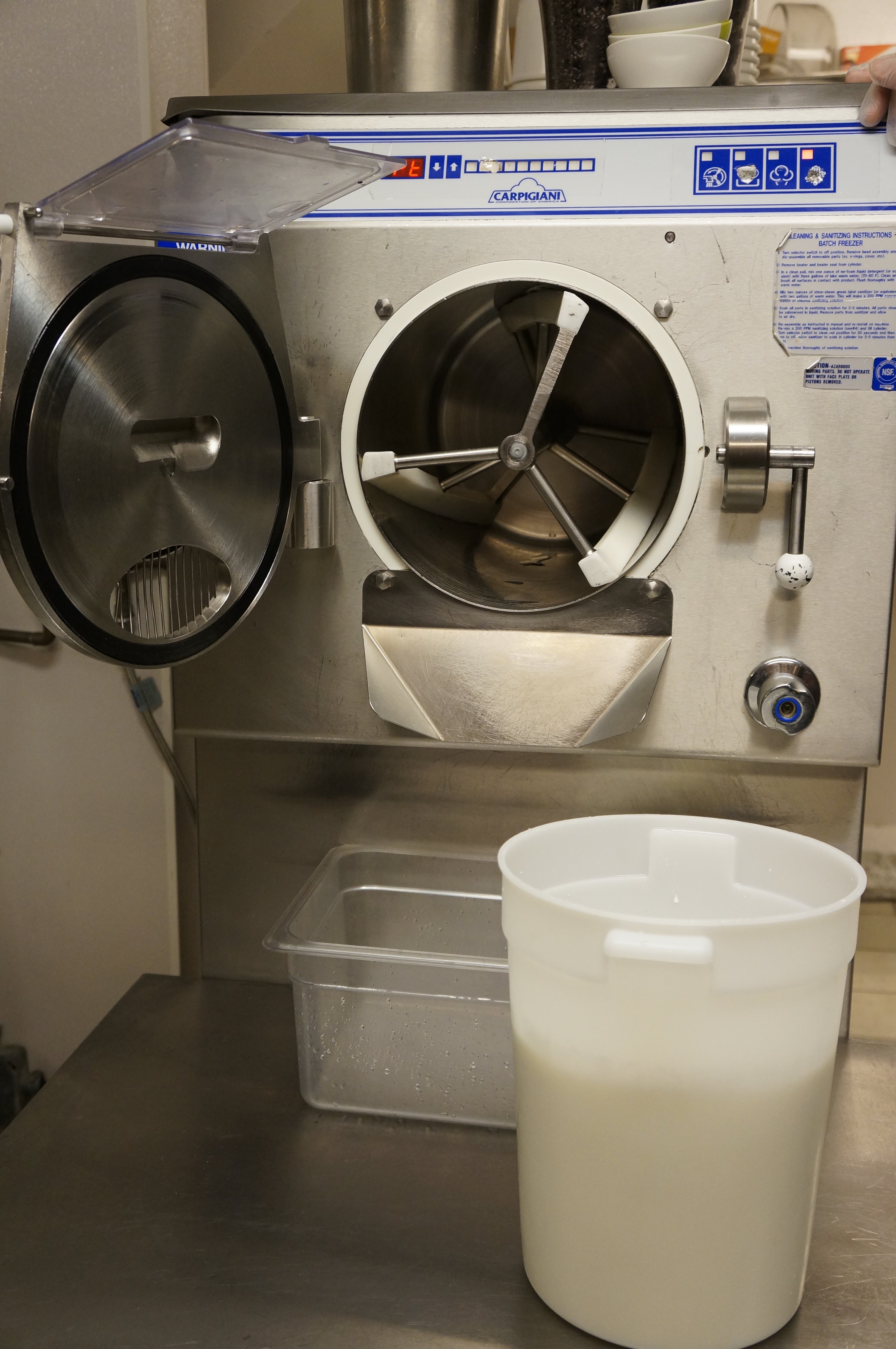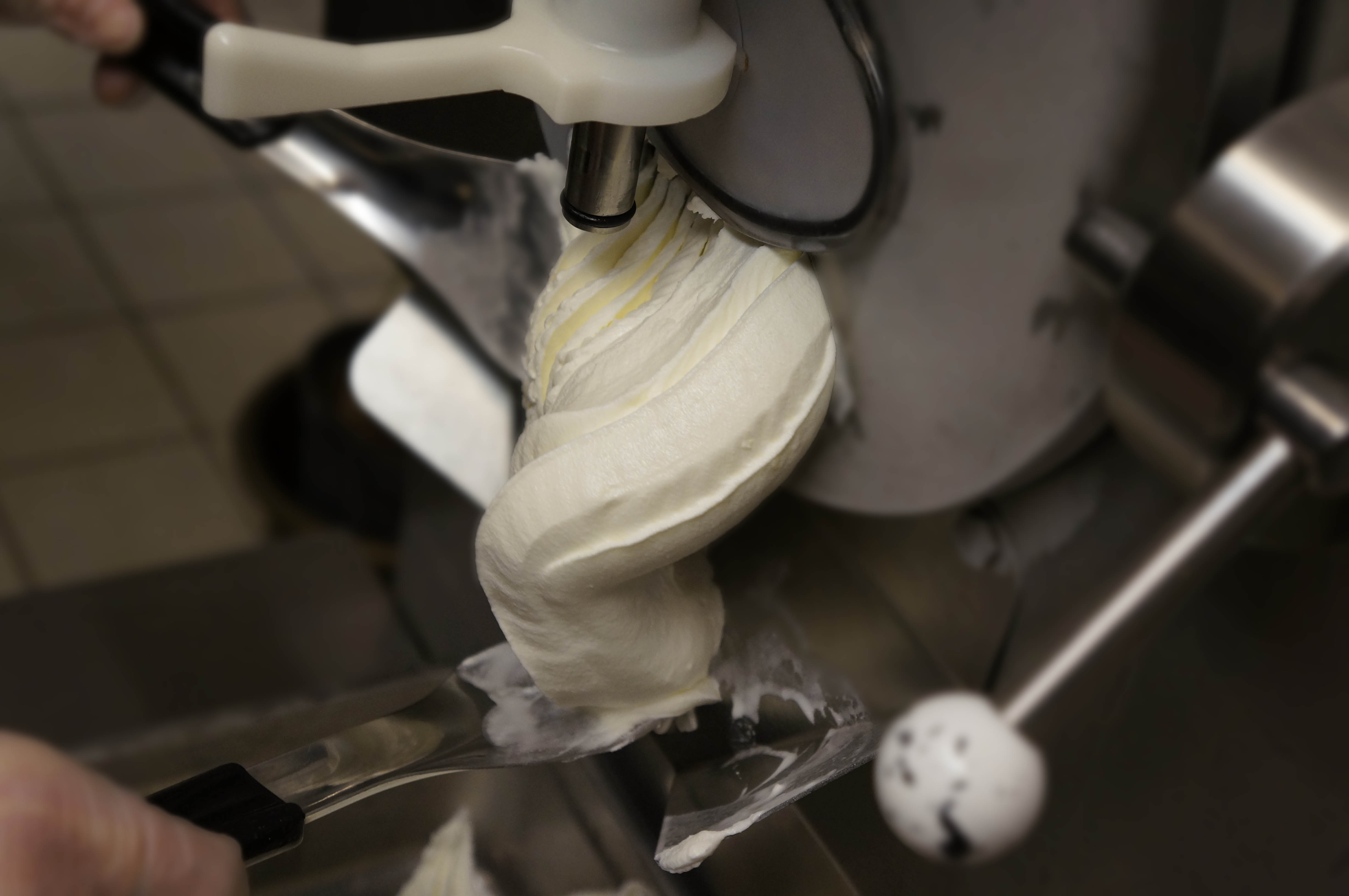 Cream (vanilla gelato) being extruded by the gelato machine during the gelato making class at Mia Chef Gelateria in NYC