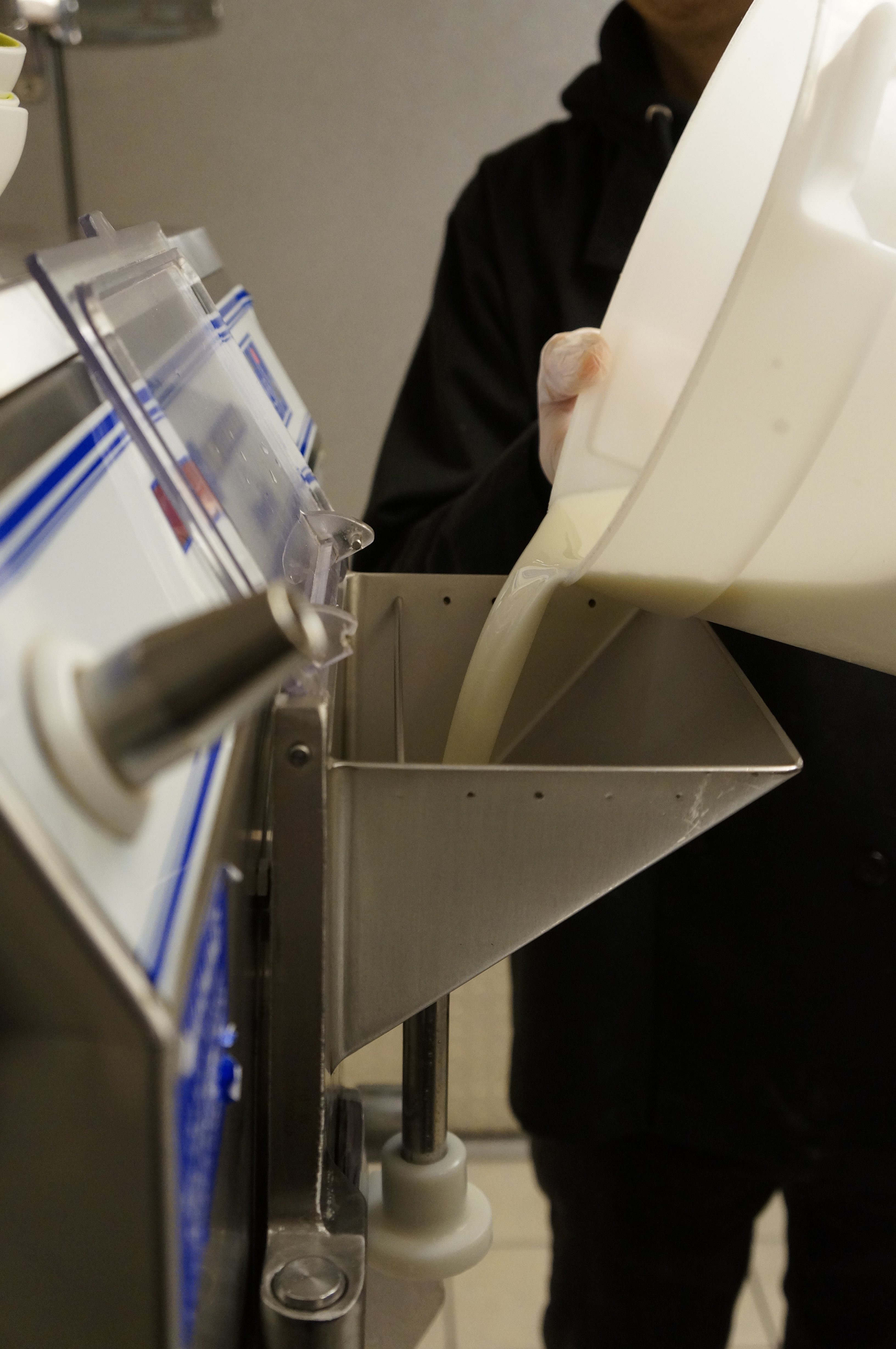 Blended mixture for the gelato base being poured into the gelato machine during the gelato making class at Mia Chef Gelateria in NYC