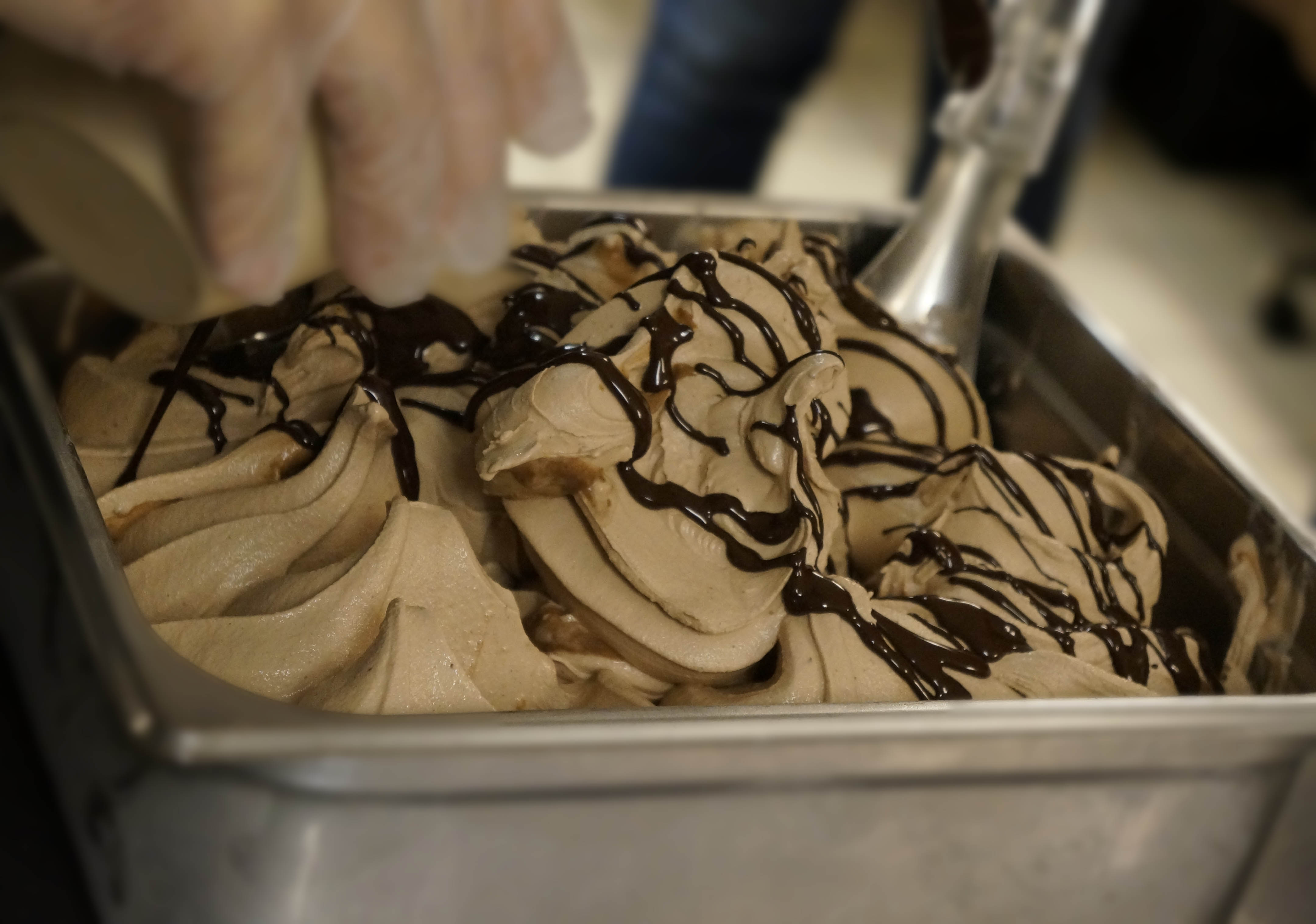 Molten dark chocolate being added to Virgin Peppermint schnapps gelato made during the gelato making class at Mia Chef Gelateria in NYC