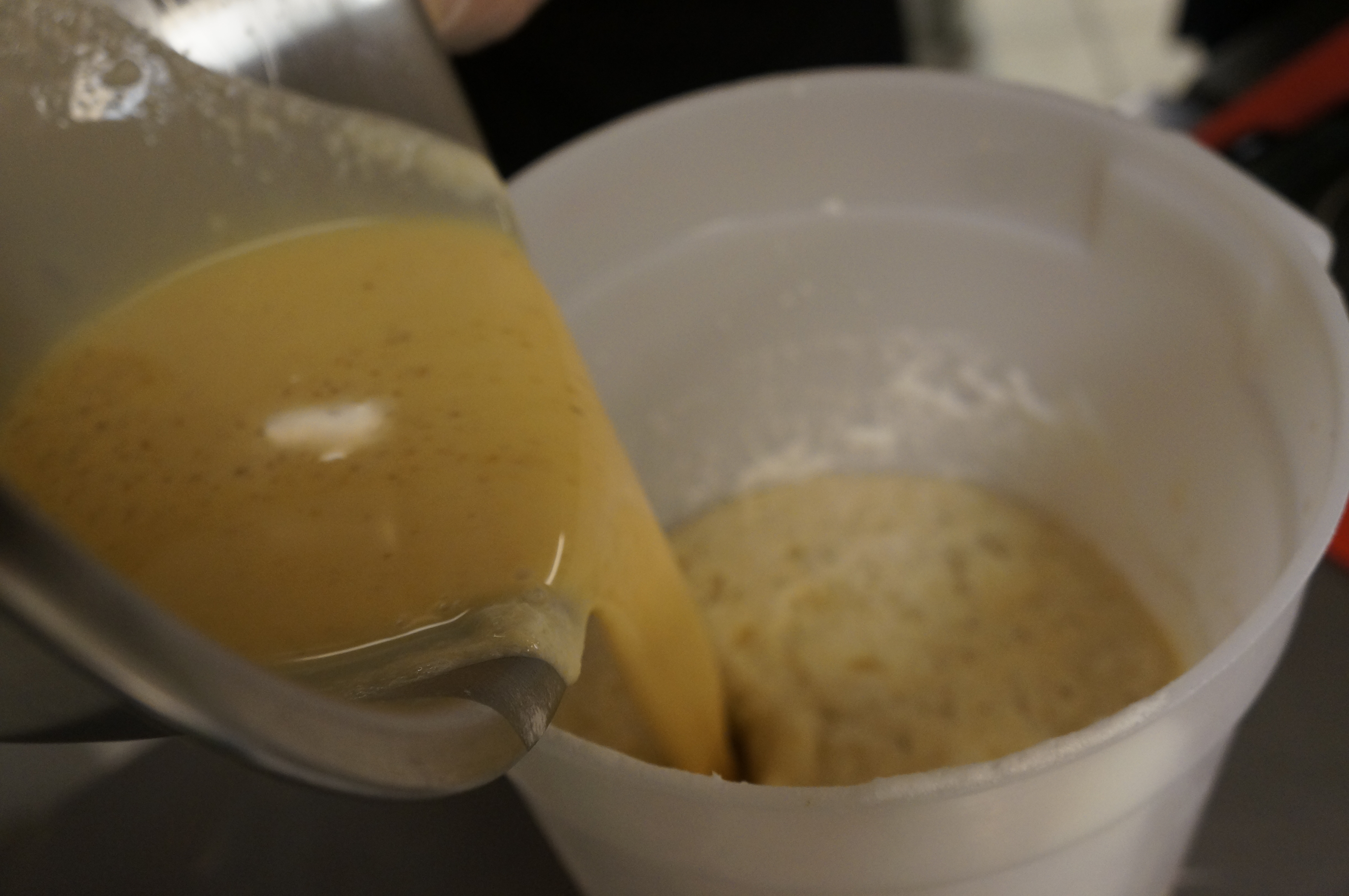 - Consolidating the blended mixture from all stations into a common bucket to make the gelato base during the gelato making class at Mia Chef Gelateria in NYC