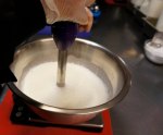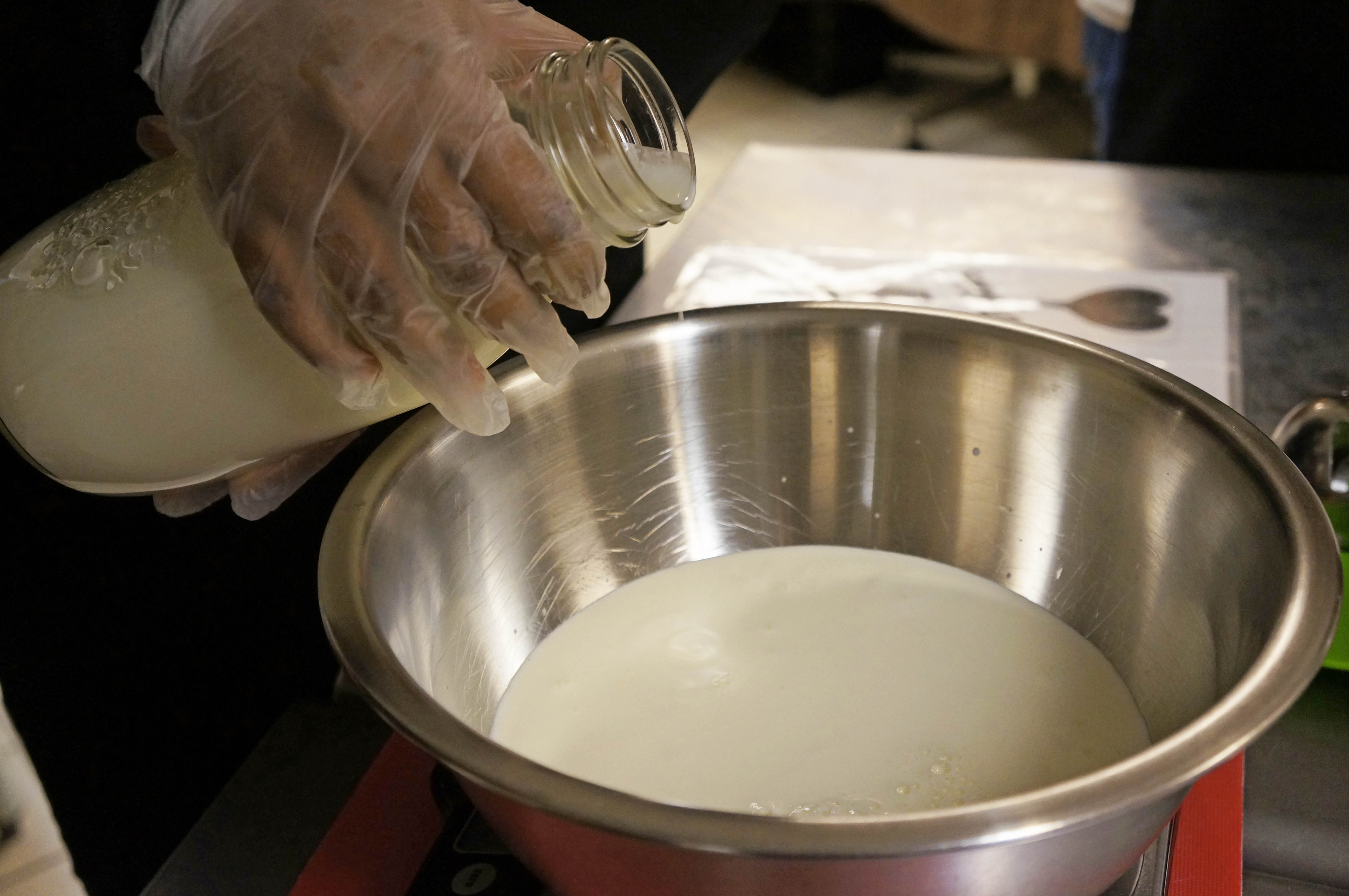 - Addition of skim milk powder to make the gelato base during the gelato making class at Mia Chef Gelateria in NYC