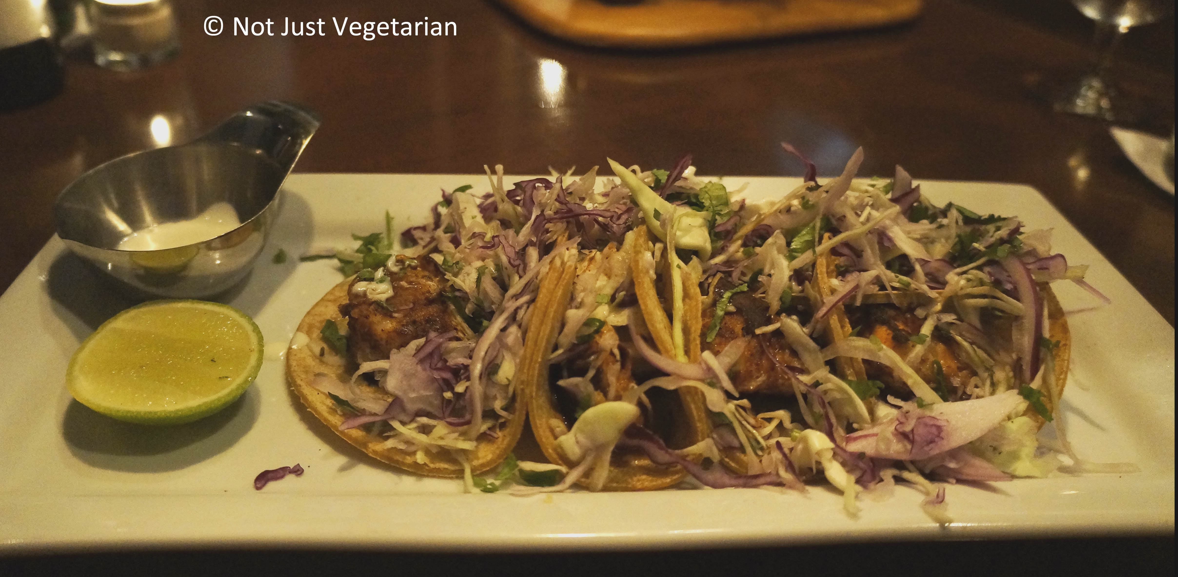 Blackened fish tacos arrived as four thick soft corn tacos, filled with fresh shredded cabbage and chopped cilantro with pieces of grouper (also the catch of the day) grilled on a charcoal grill. This is one of the freshest dishes that I have ever had. The blackened pieces of grouper were soft, well-seasoned with spices (mostly chipotle chilies, and salt and black pepper as I can recall from the taste) and were fantastic overall. The tacos were served with two sauces – chipotle and avocado. The tacos were a meal by themselves. We were keen to eat the Chef’s special that we had ordered and so, did not finish this dish.