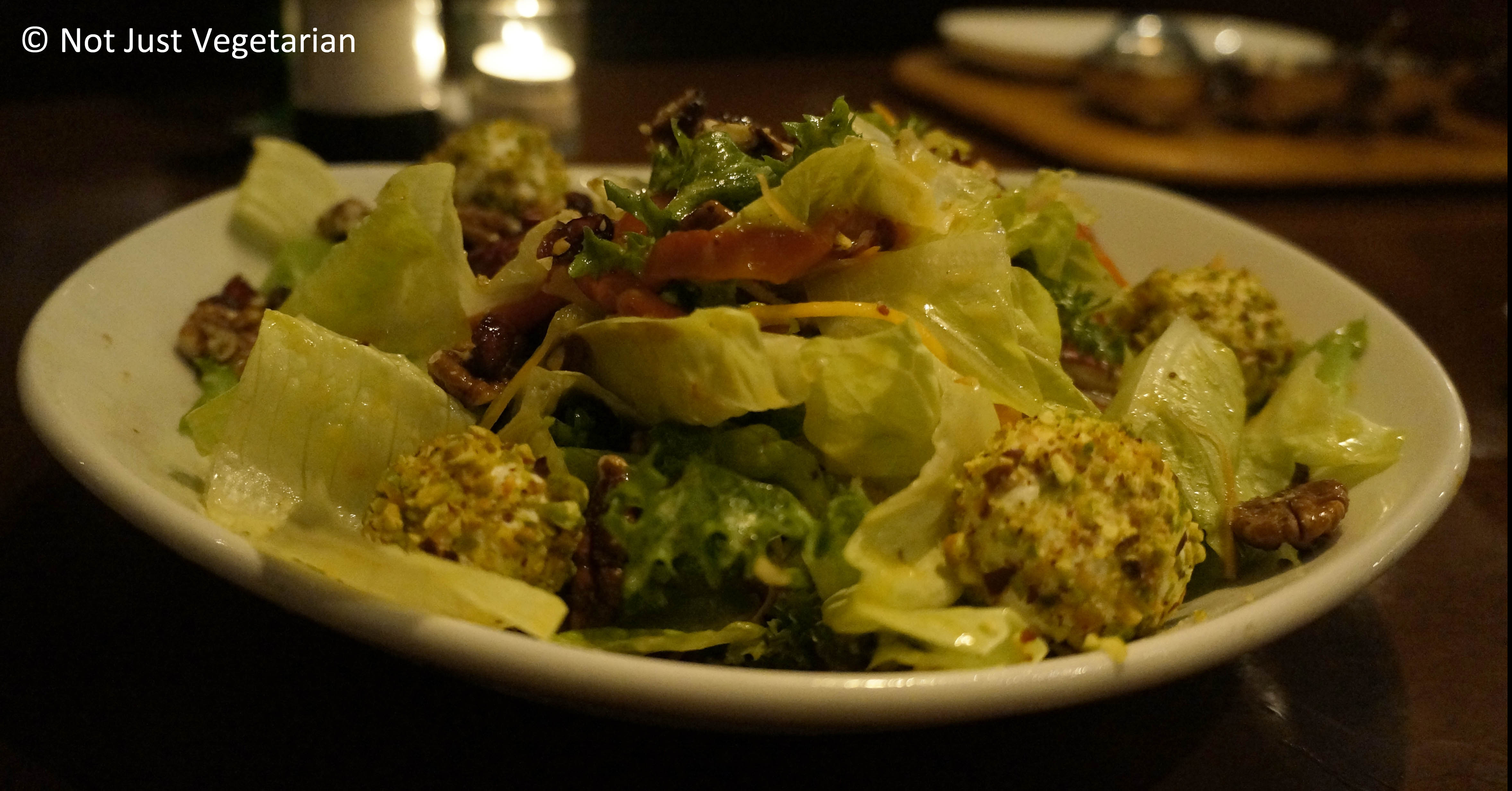 Fred’s Salad with pistachio crusted goat cheese balls, walnuts, cranberries, and mixed lettuce in a mango-lychee dressing at Fred’s House Seafood Market & Grill in Cancun