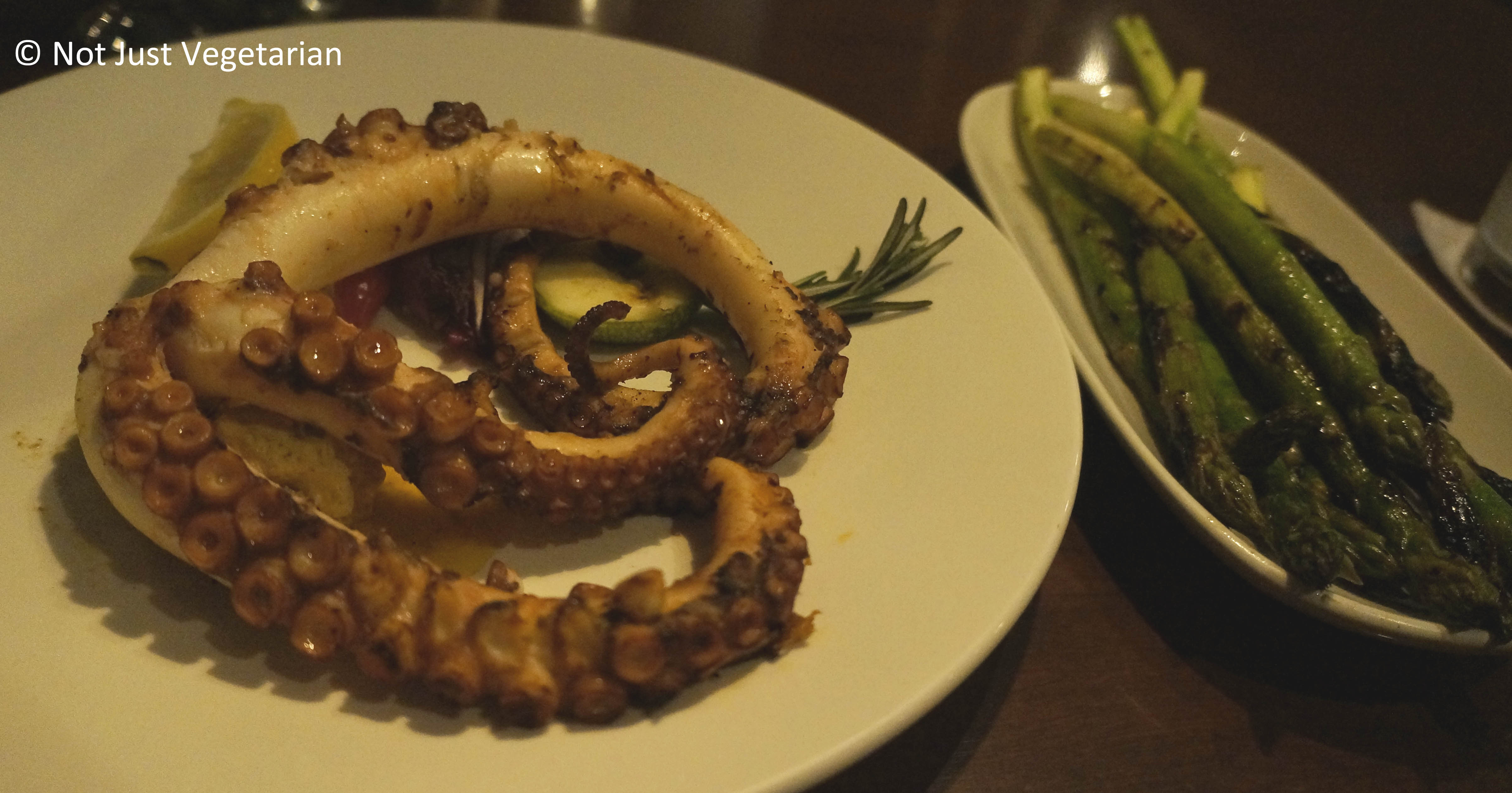 Chef’s Special of Octopus in Coriander butter with a side of grilled asparagus at Fred’s House Seafood Market & Grill in Cancun, Mexico