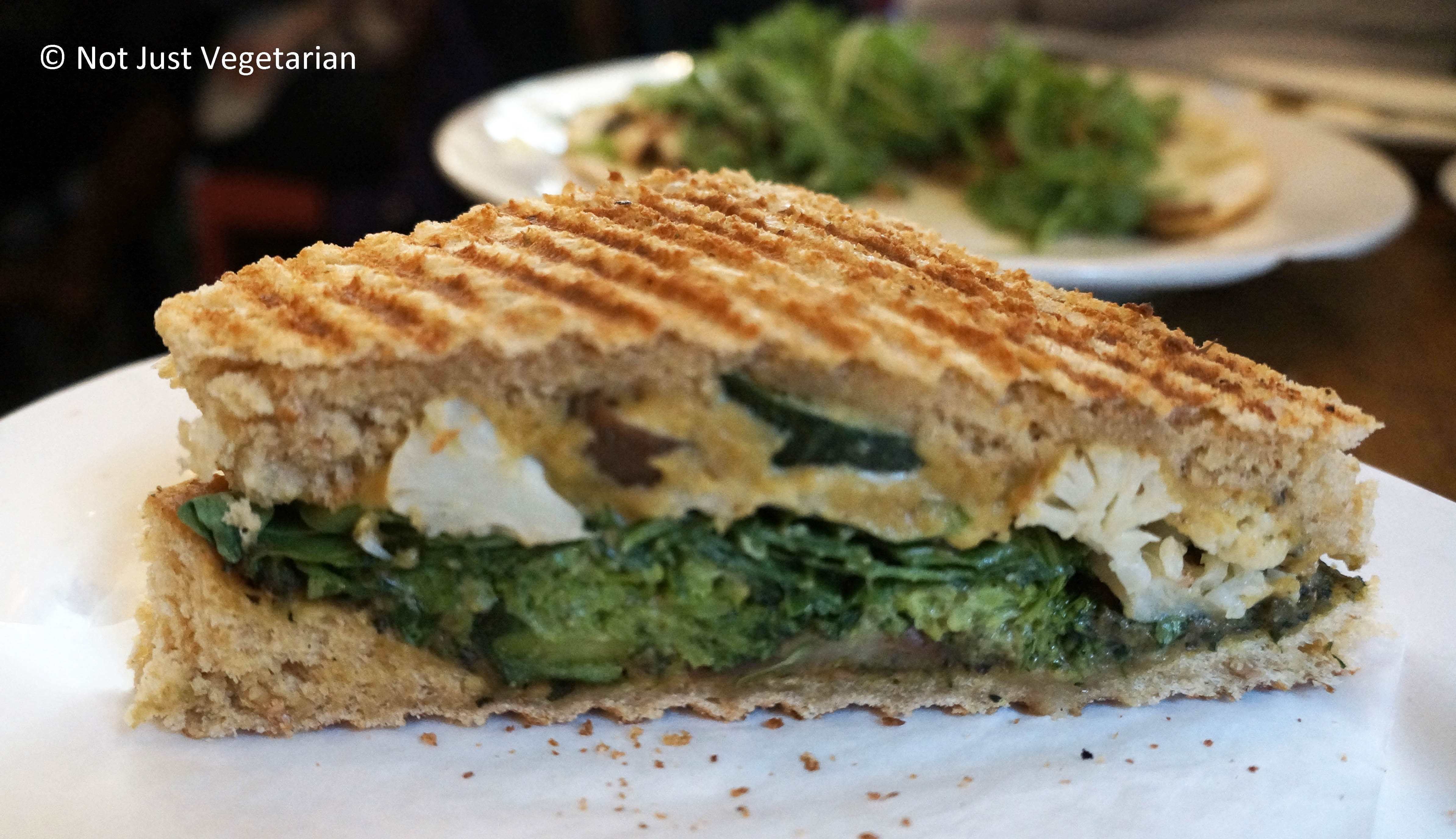 Vegan mediterranean oven-dried seasonal vegetable (Broccoli, cauliflower) Panini with cashew cheese and basil spinach pesto at Peacefood Cafe NYC