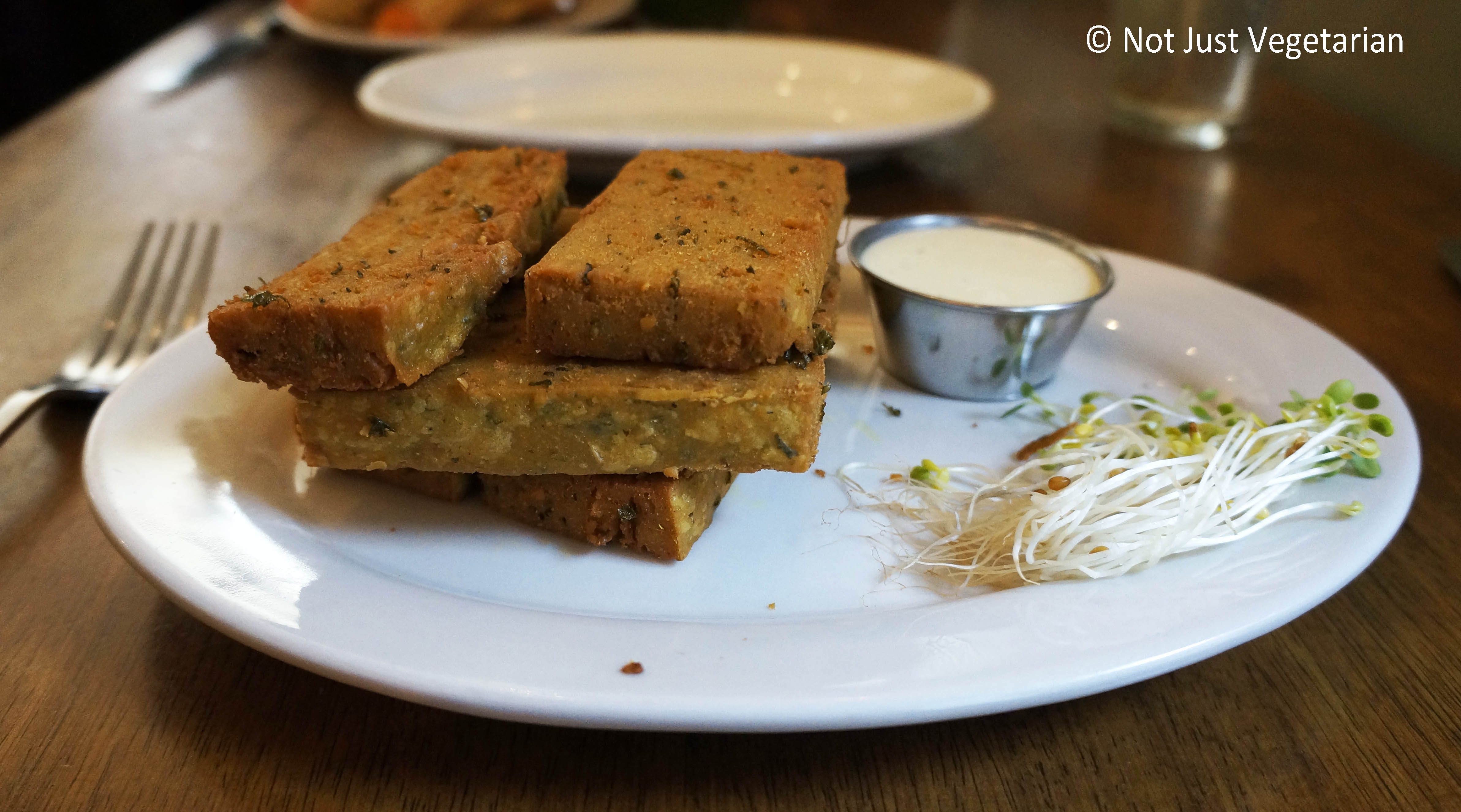 The chickpea fries were slabs of spiced chick pea flour / dough and deep-fried. We did not know what to expect. These fries were crispy on the outside and soft inside – a wonderful texture. The dipping sauce felt like it had some tahini in it, but not sure what went into it. I loved this savory dish.