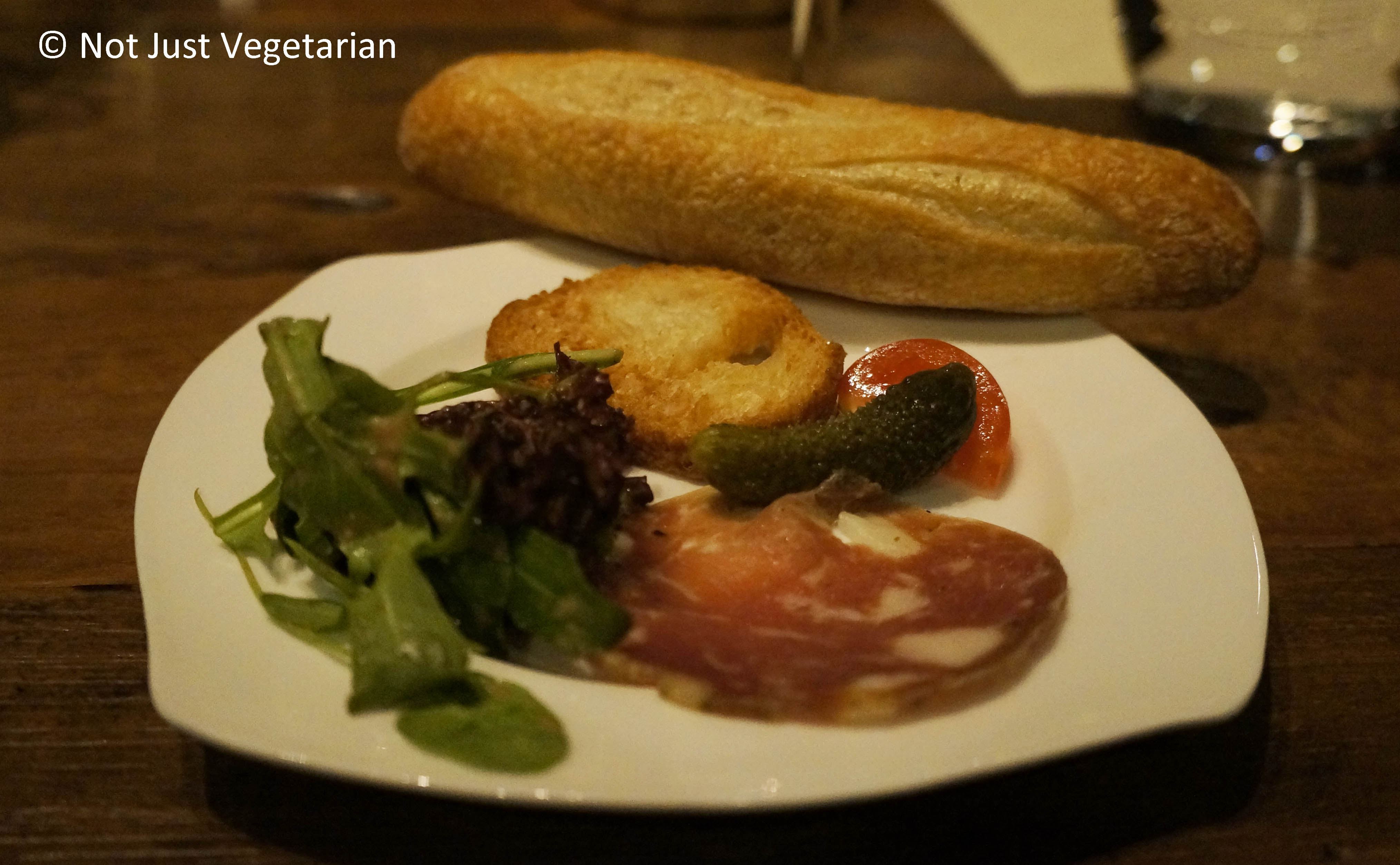 The wine selection for the evening was a Vouvray (demi sec) made from Chenin Blanc grapes at Chateau Montcontour. Chef Claude Godard was kind enough to share this wine from his private collection with us that evening. The wine was velvety in texture, fruity, and sweet – something that I like , and was popular at the table that evening. More about this wine here. This wine took me back to the few late Spring days that I spent in the Loire Valley… ah, bliss……!! Well, back to the food at Jeanne & Gaston. Charcuterie The charcuterie board arrived with cuts of rosette de lyon, garlic sausages, cornichons, and chicken liver mousse. The table favorite for the evening was the chicken liver mousse, which I did not get to try. I loved the mini baguettes that arrived for the table.