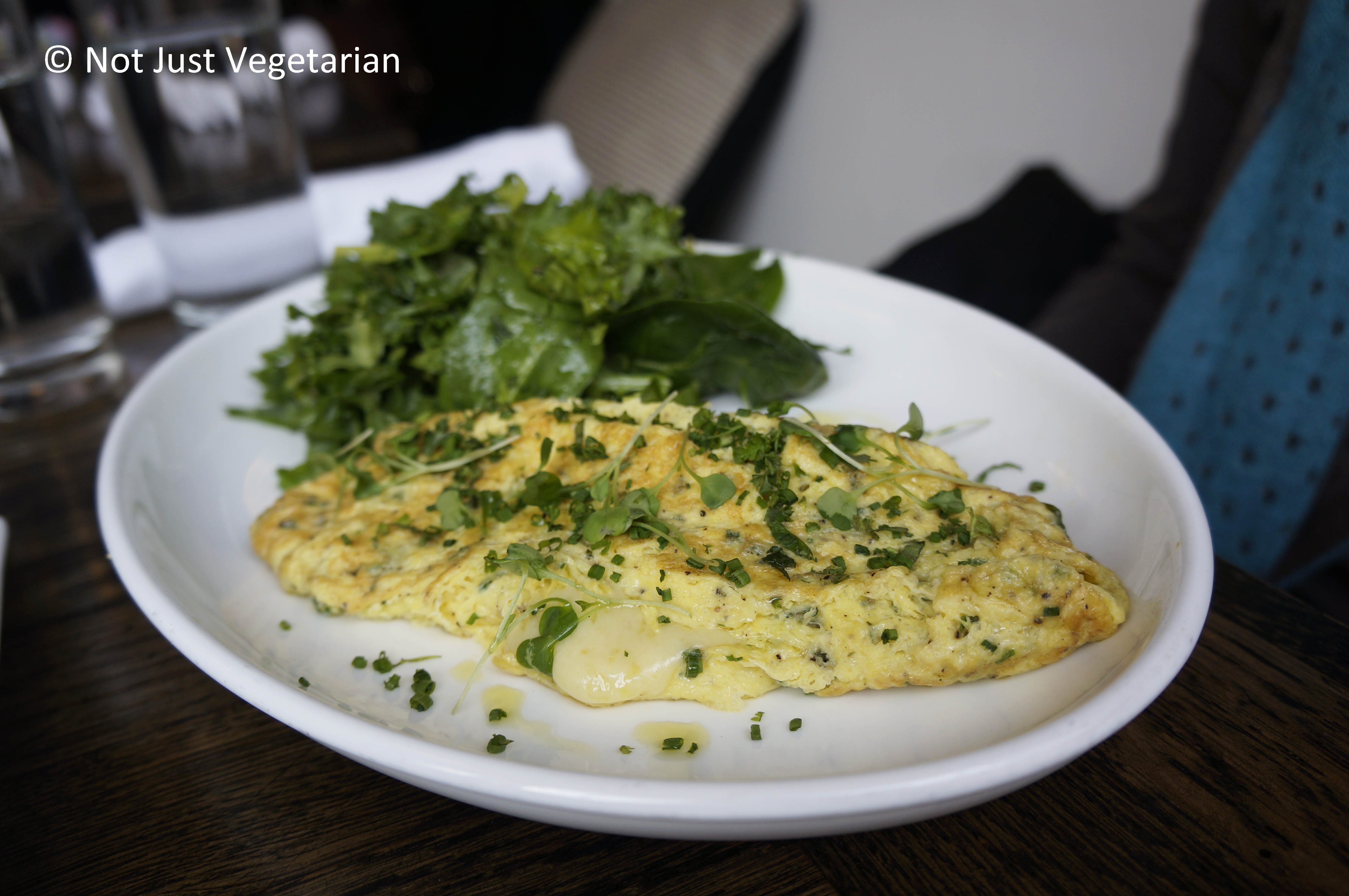 Two egg omlette: The omlette was made with gruyere cheese and fine herbs. Loved it – was it because it had adequate salt and pepper without us having to add anything to it or was it because the gruyere was added at the right time, that it was just oozing out of the omlette when it was served? Either way it was perfect and so were the side of greens and the chopped chives and herbs sprinkled on top.