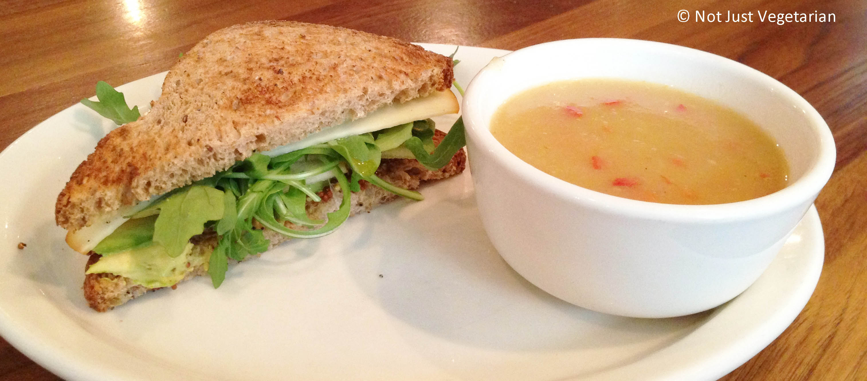 Vegetable soup and a sanchwich (local apple, smoked cheddar, avocado,arugula, and whole grain mustard on multi-grain bread) at Indie Food and Wine NYC