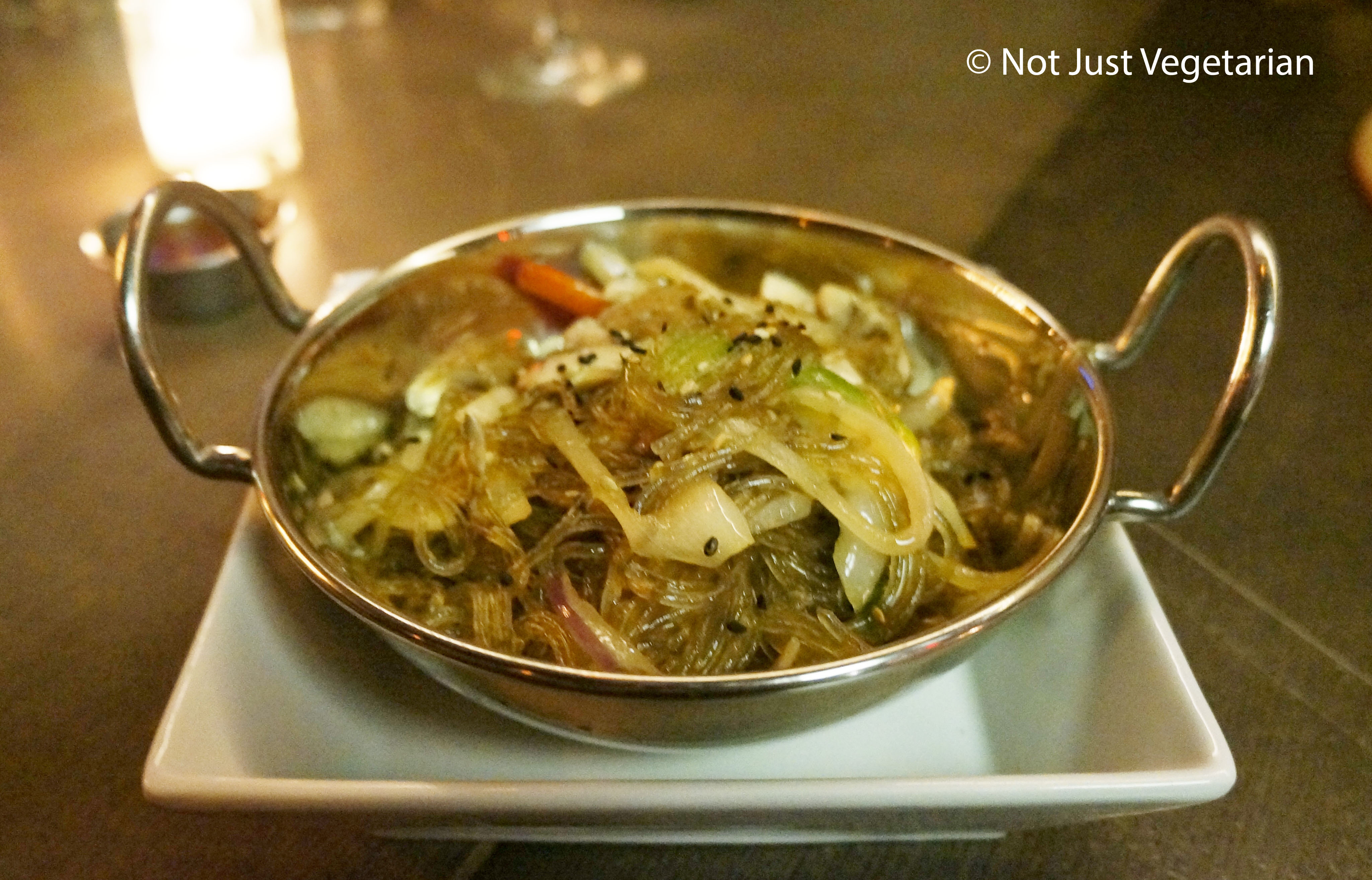We got the Jap Chae (Korean sweet potato noodle bowl). It tasted good with the few pieces of cremini and shitake mushrooms and vegetables, although we could see several tablespoons of oil swirling at the bottom of the pan.