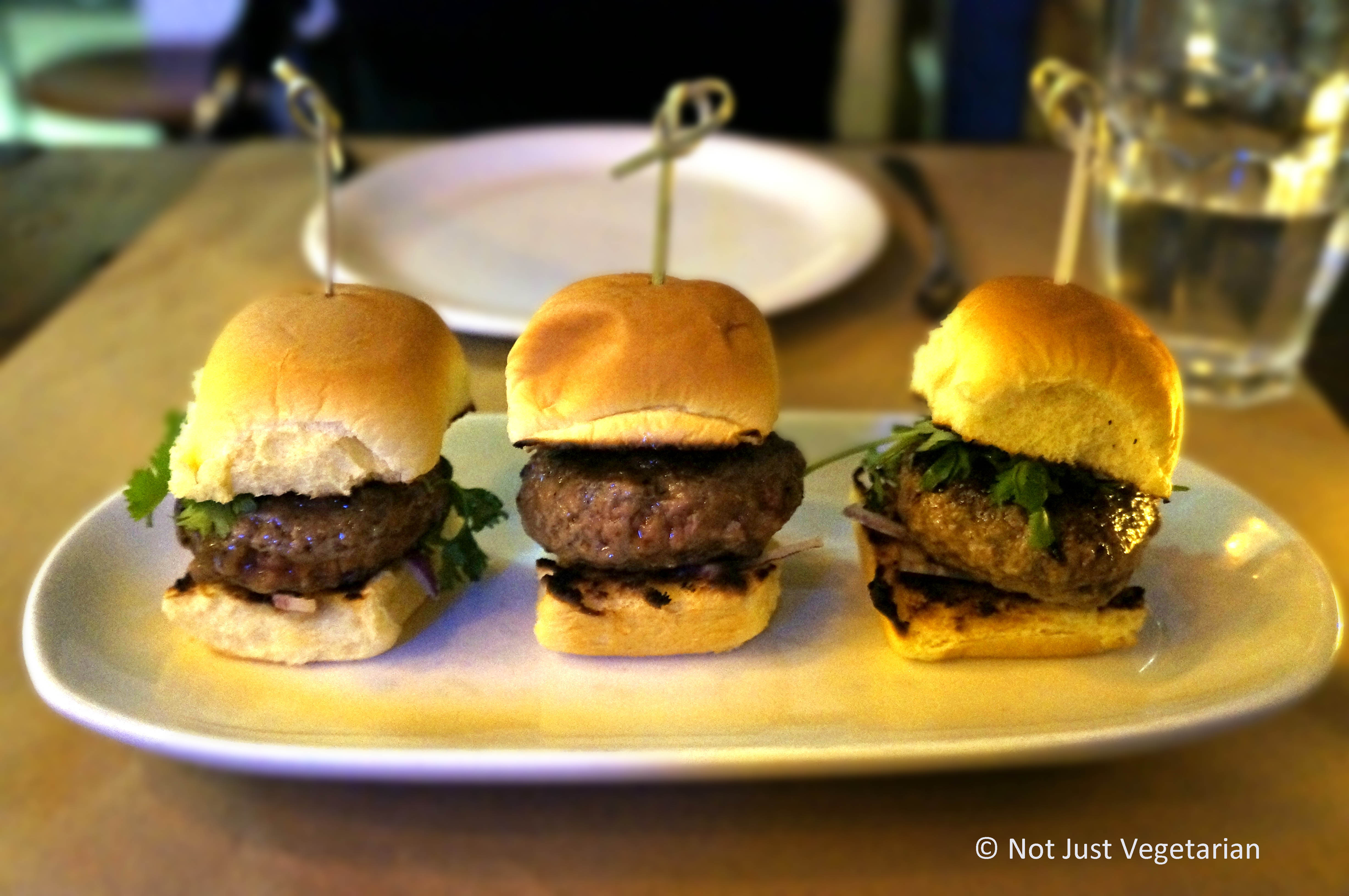 - I opted for the spiced lamb burger bites (sliders, really) with sumac aioli (yumm, I thought!), but was disappointed that the aioli on each slider was barely as large as a dime – not even a nickel! The lamb was rare with a thin crust and had little to no flavor (where was the spice??). And yes, there was a tiny sliver of a red onion – nope, no caramelized onions to boost flavor. I did get more aioli when I asked for more, yay!!!