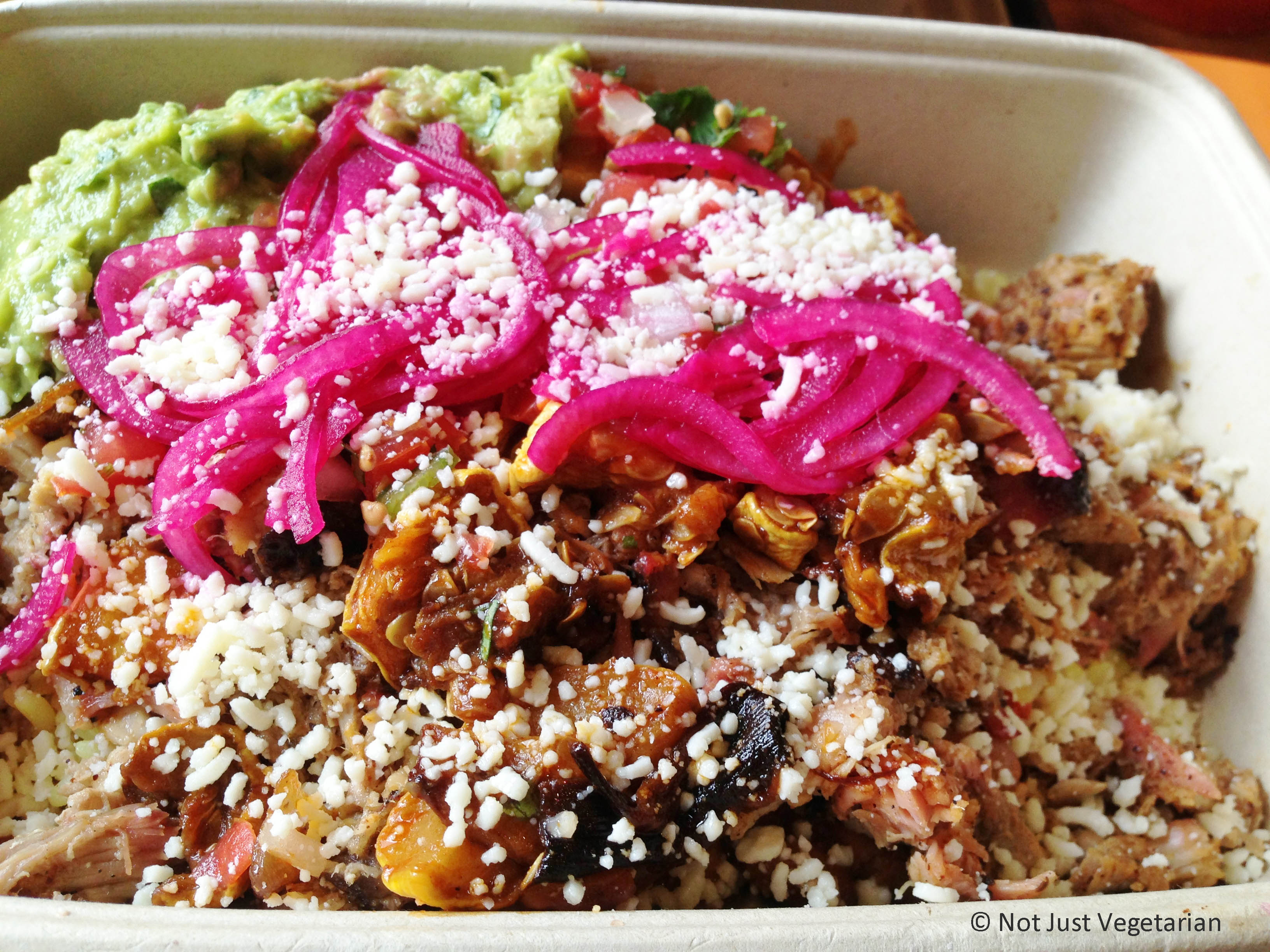 Burrito (bowl) with slow-cooked tender pork, with grllled squash, yellow rice, pinto beans, pickled onions, cotija cheese, and guacamole at Tres Carnes NYC