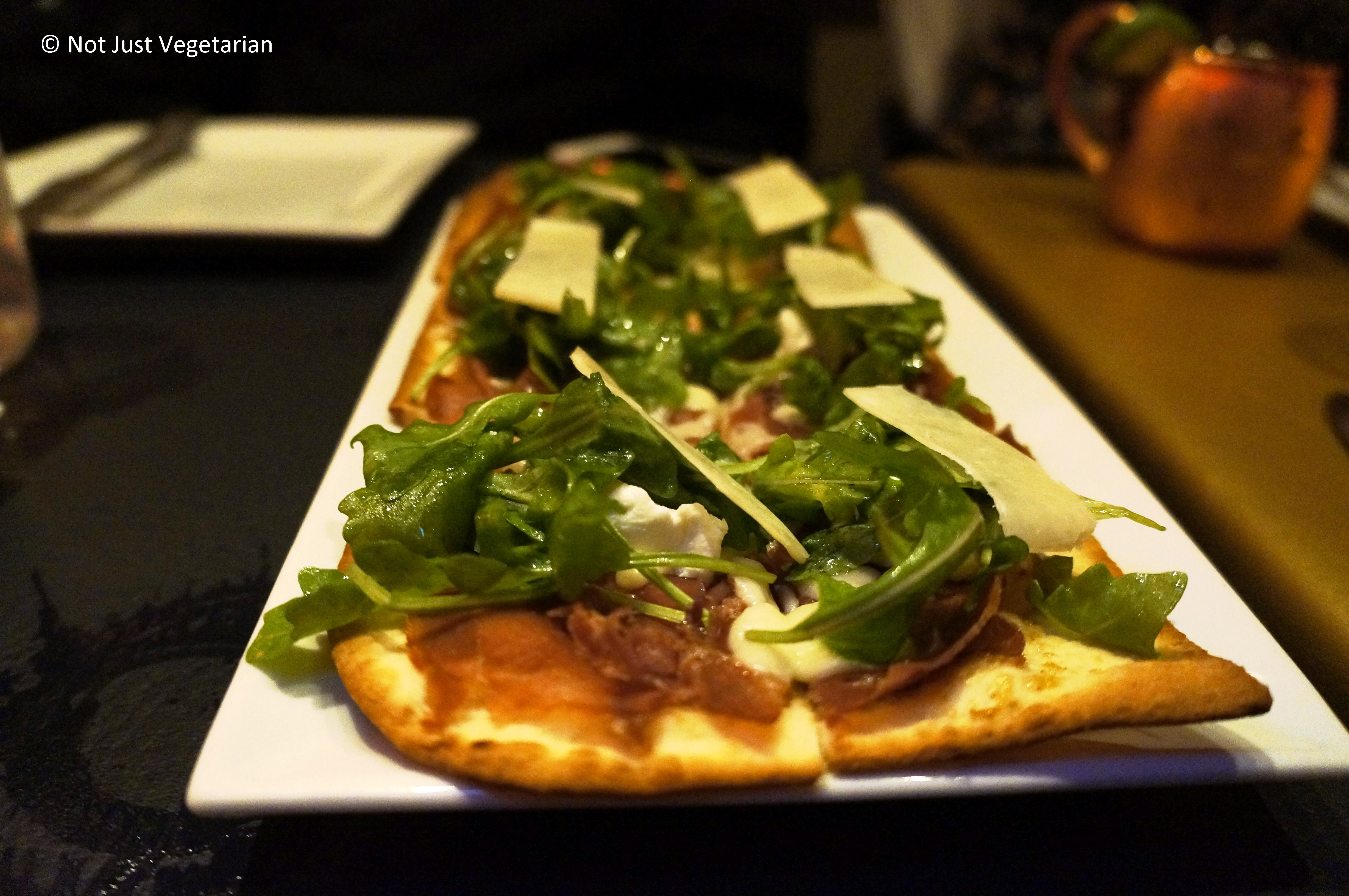 Flat bread with arugula, goat cheese, fig, prosciutto and some pecorino romano at Masq restaurant and lounge, NYC