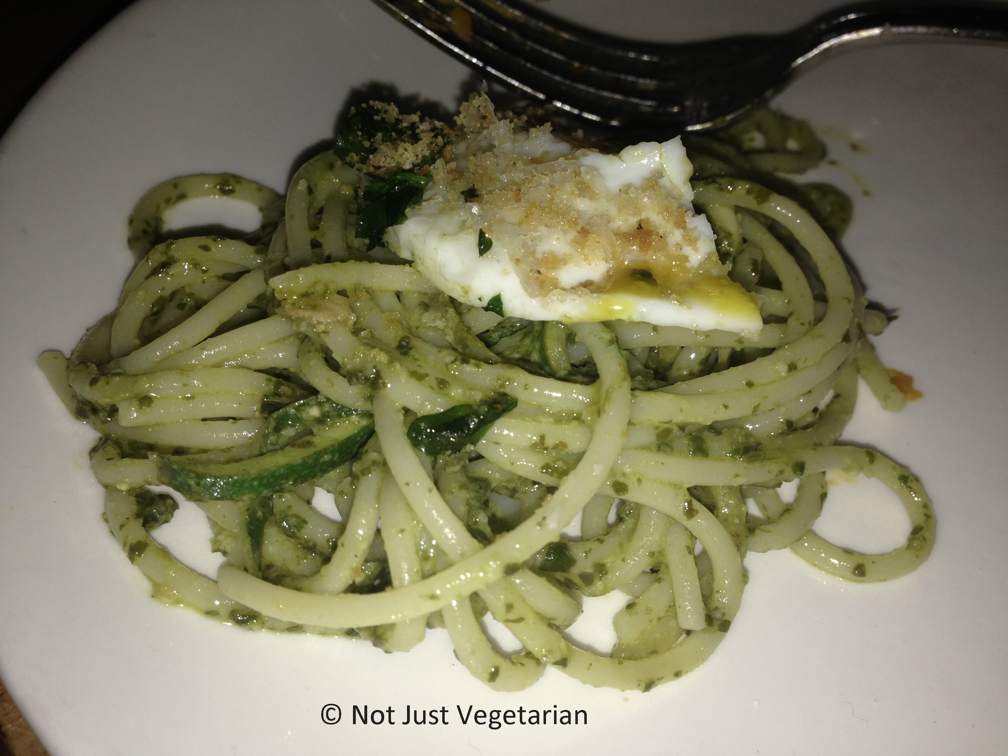 Spaghettini with zucchini, lemon, parsley pesto, parmigiano and sunny side up egg at Beauty & Essex in NYC